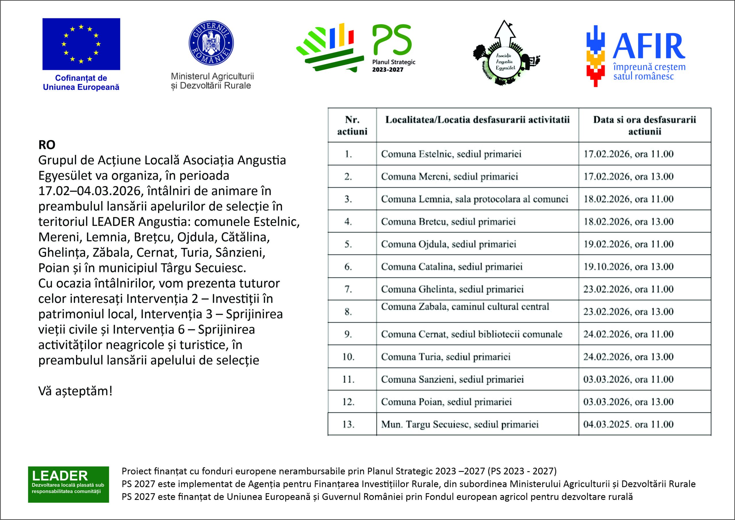 A találkozók alkalmával bemutatjuk minden érdeklődő számára a 2. intézkedés-A helyi örökségvédelem támogatása, a 3. intézkedés-A civil tevékenységek támogatása és a 6. intézkedés – A nem mezőgazdasági és turisztikai tevékenységek támogatására vonatkozó információkat, a Pályázati Felhívás megnyitását megelőzően.