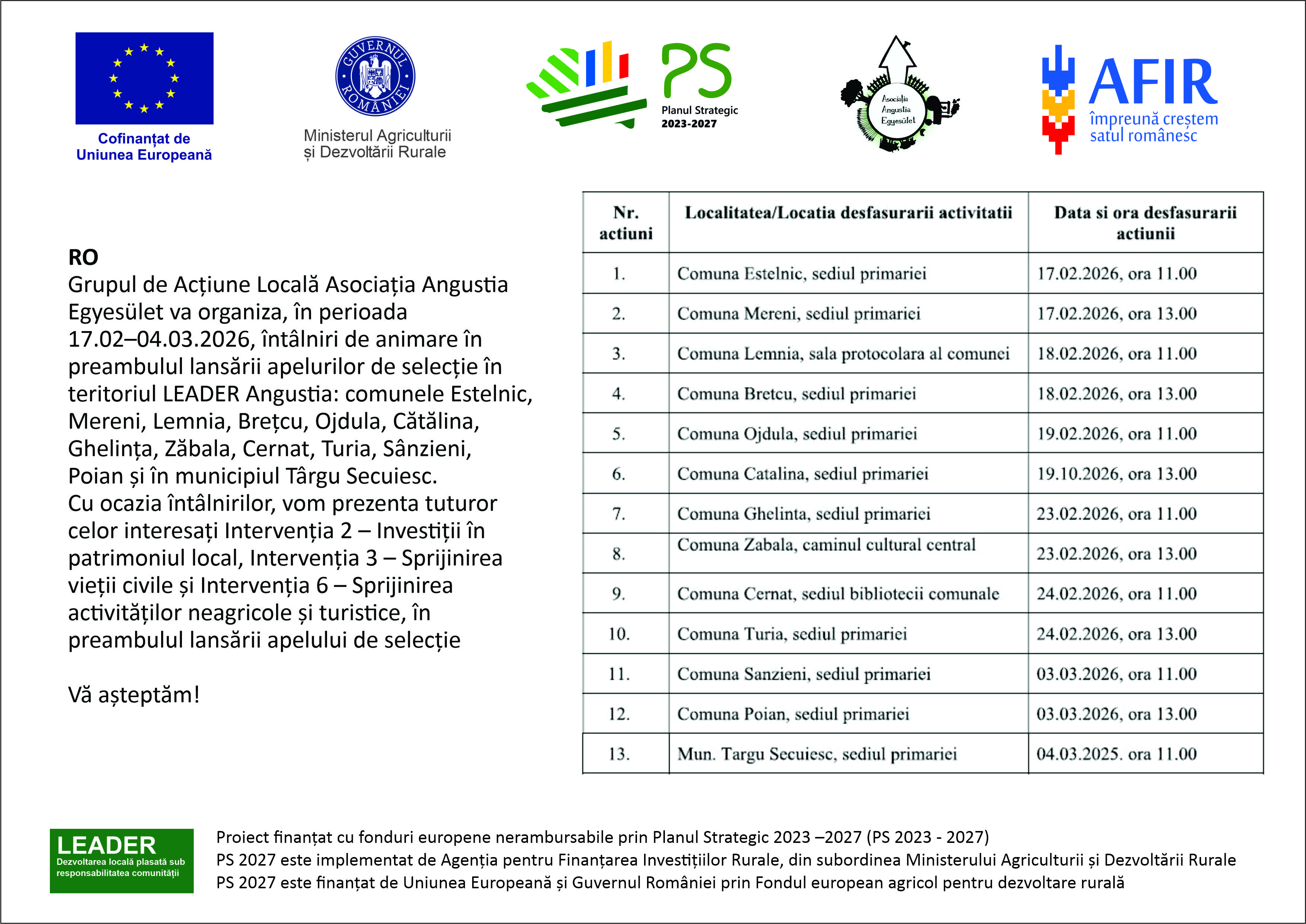 Cu ocazia întâlnirilor, vom prezenta tuturor celor interesați Intervenția 2 – Investiții în patrimoniul local, Intervenția 3 – Sprijinirea vieții civile și Intervenția 6 – Sprijinirea activităților neagricole și turistice, în preambulul lansării apelului de selecție